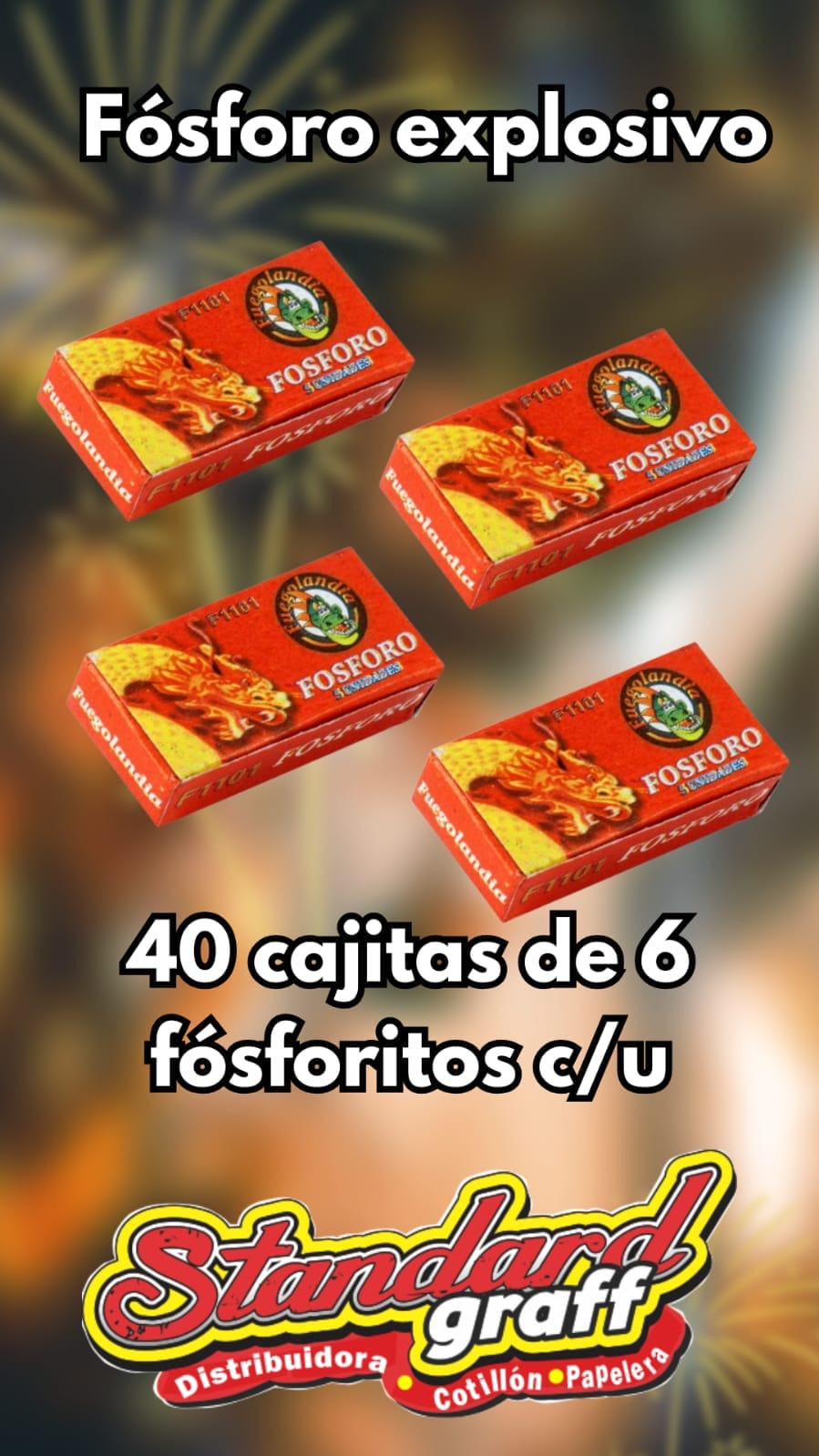 Fosforo explosivo x40 cajitas de 6 fosforitos CategoríasBanderas Banderines/Cortinas Bazar Bengalas Bolsas Cajas Carteleria y Señalizacion Descartables Dia de la Madre Fajas Fluo Adhesivas Globos Globos numero Halloween Navidad y Año nuevo Pascuas Reposteria San Valentin Stickers Tarjetas Telgopor Varios Velas Viruta Sin categoría Fosforo explosivo x40 cajitas de 6 fosforitos$4.650 AgotadoSin existencias Categorías: Navidad y Año nuevo, Varios Productos relacionados AgotadoLluvia metalizada Navideña Dorado $630 AgotadoAdorno Navidad puntal estrella gibreado de 12cm – x1 Dorado $610 AgotadoLluvia metalizada Navideña Rojo $630 AgotadoBolsas Celofàn navidad 15×35 – x 25 unidades $1.105